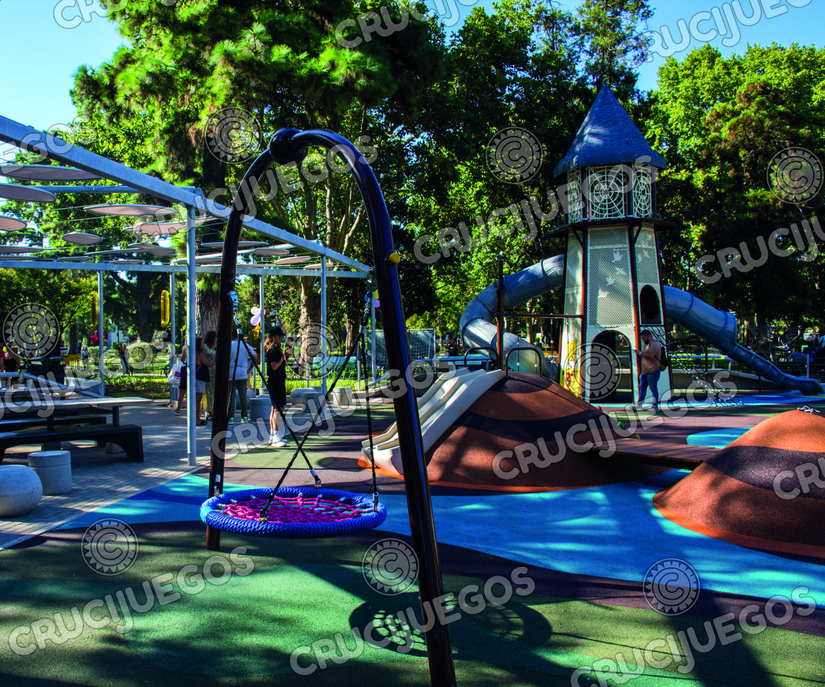 Todos los juegos han sido cuidadosamente diseñados con esta esencia, y se han instalado en un piso antigolpes que recrea un mini paisaje con diferentes topografías y elementos naturales. Además, se han añadido nuevos bancos, mesas, pictogramas, cartelería y elementos de paisajismo circundante para crear áreas agradables de descanso tanto para los padres como para los niños.