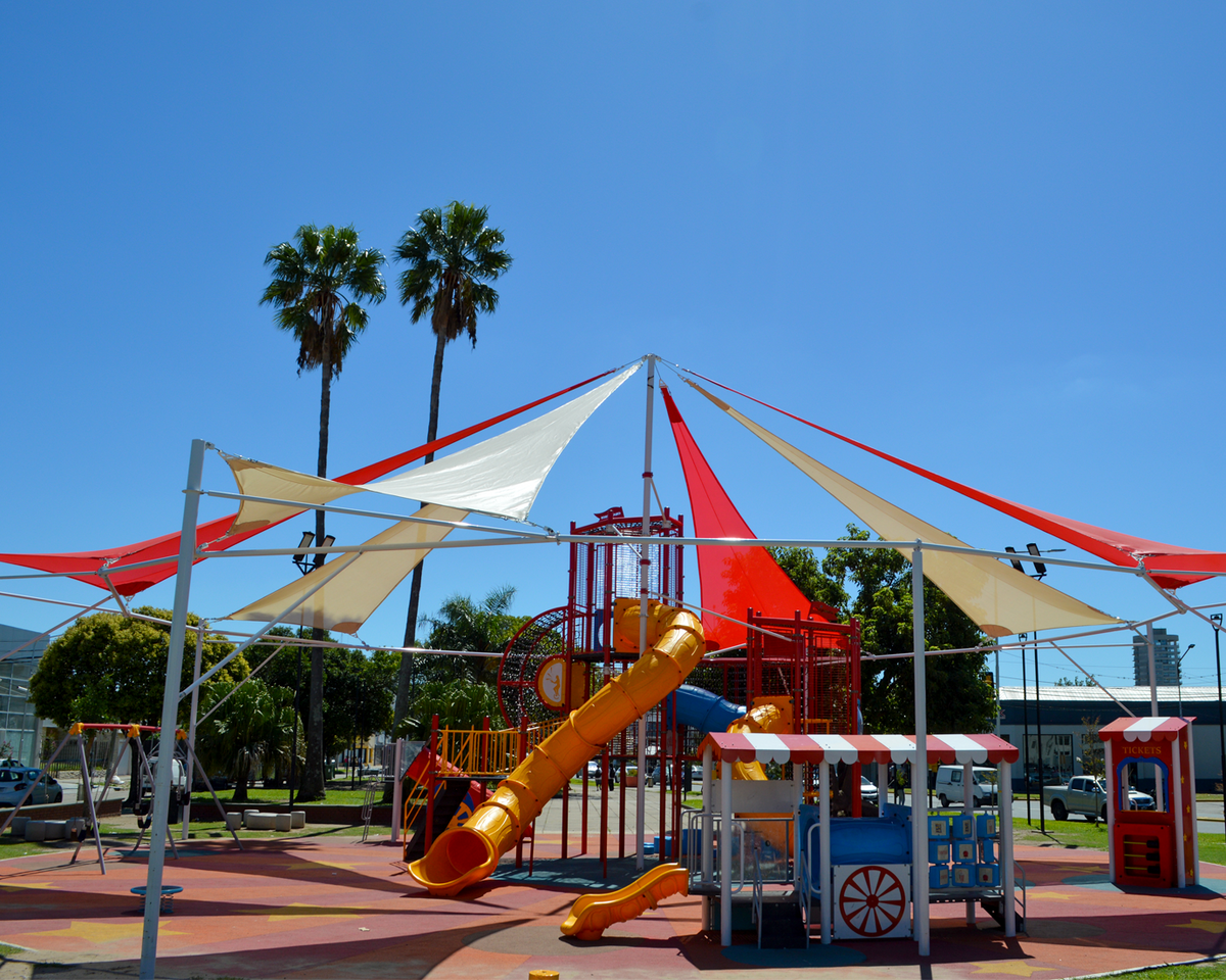 Además, cuenta con un sistema de protección solar, denominado shadow, en toda la superficie de la plaza. Esta es una estructura diseñada para ofrecer una solución estética y funcional, ideal para proporcionar sombra y a su vez, simula ser la carpa del circo.