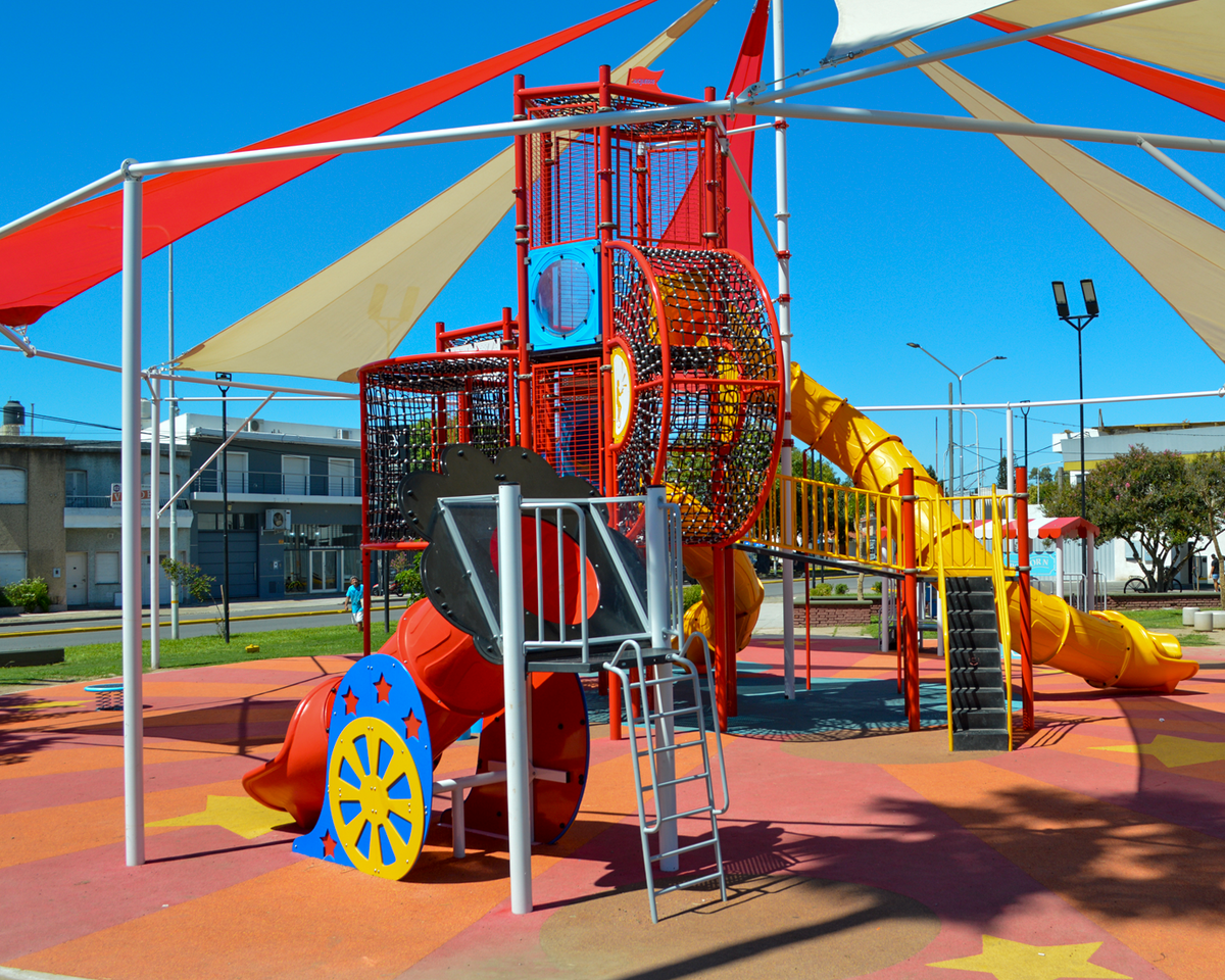 Con un imponente mangrullo con forma de circo cuenta con distintos dispositivos lúdicos: paneles de memoriatroncos de equilibrio, redes trepadoras. Tubos y trapecios para que los más pequeños pongan en juegos su destreza y porqué no ¡Sentirse parte de un espectáculo circense!