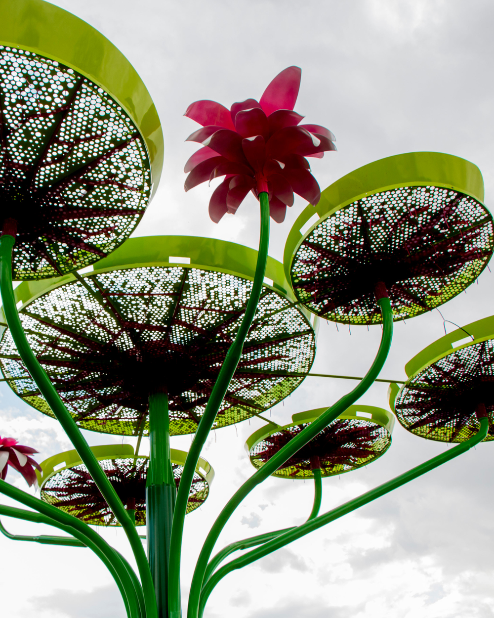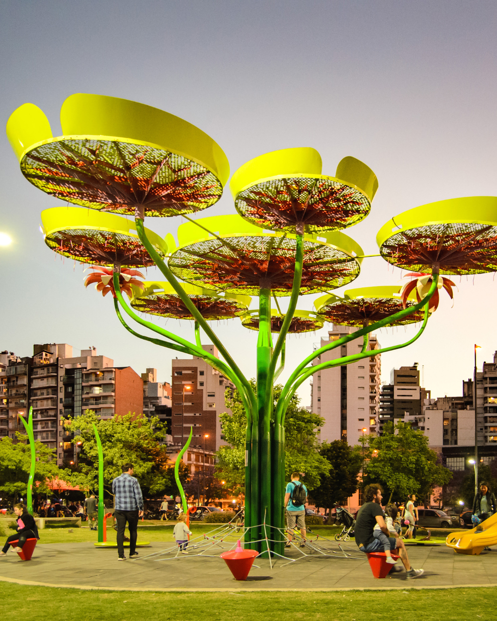 Ubicado en Rosario, Santa Fe, El Irupé es un parque de juegos escultórico creado para la Municipalidad de Rosario. Su diseño toma como inspiración a la emblemática planta acuática del río Paraná, reinterpretada a gran escala para que niños y niñas puedan explorarla, treparla y habitarla. Las imponentes hojas metálicas generan sombra parcial sobre el área de recreación, mientras que desde abajo se revelan formas orgánicas y nervaduras que aportan un fuerte valor estético al espacio público.