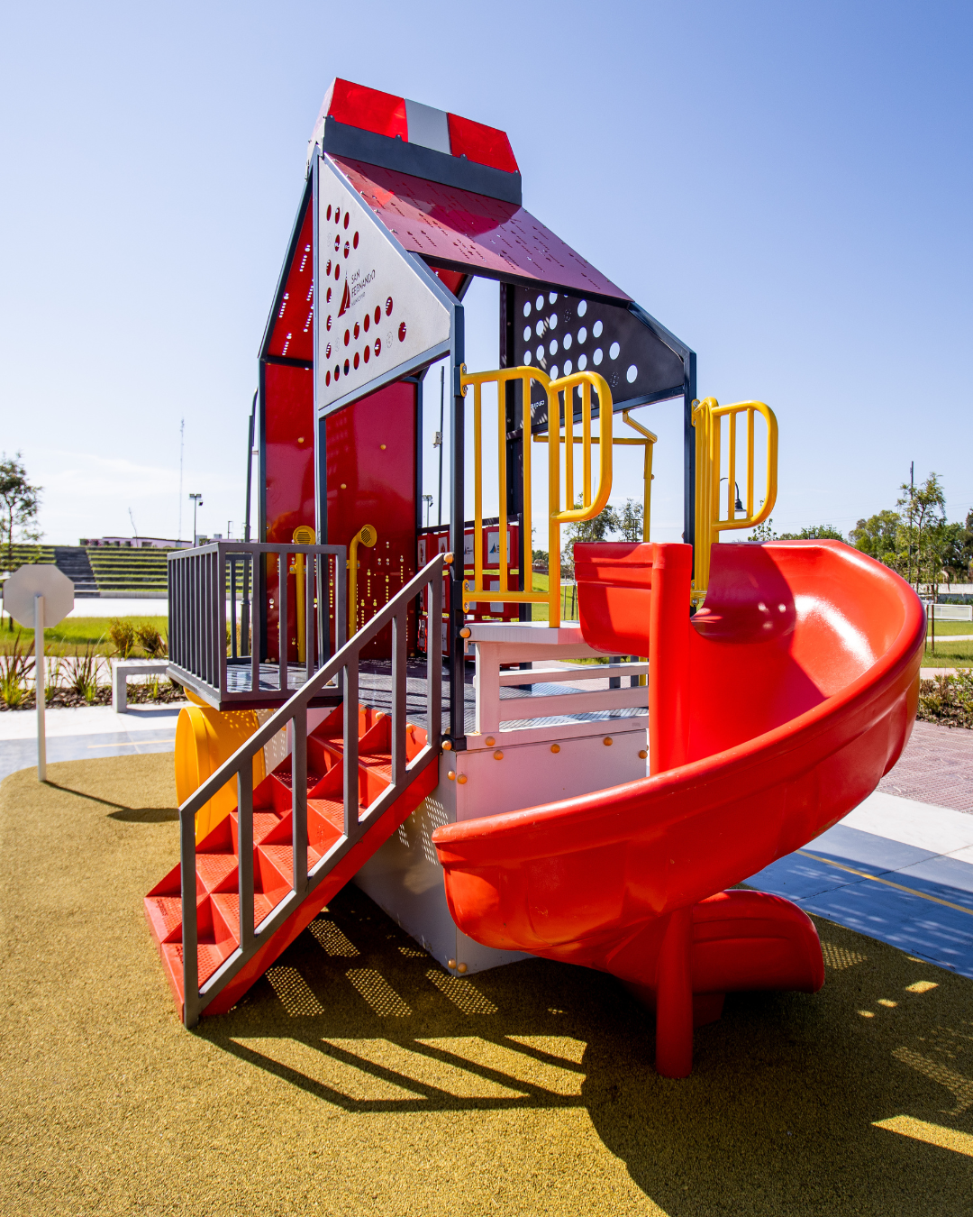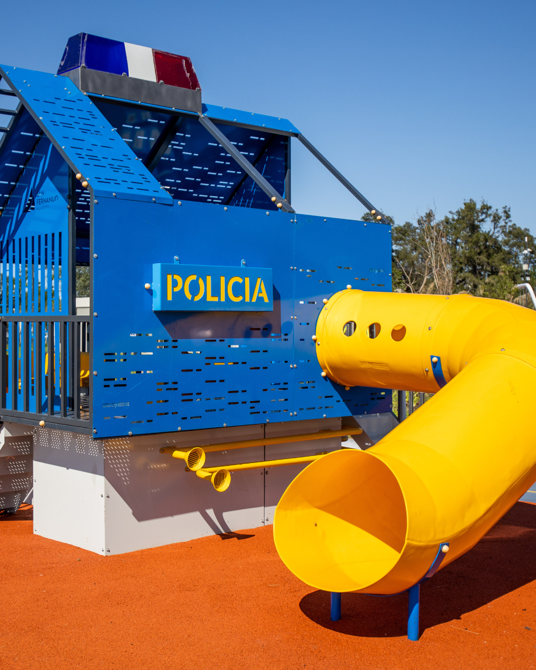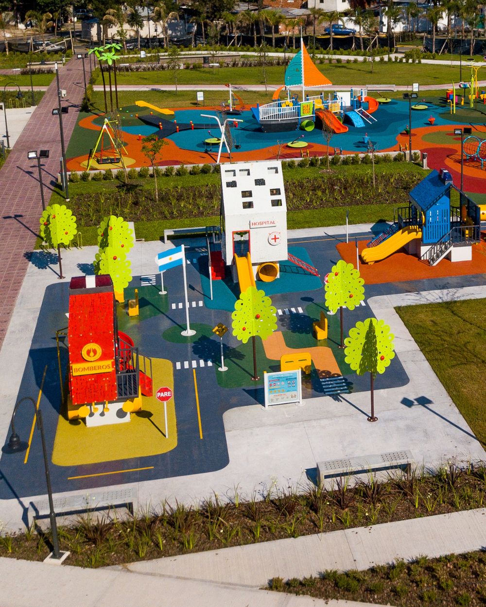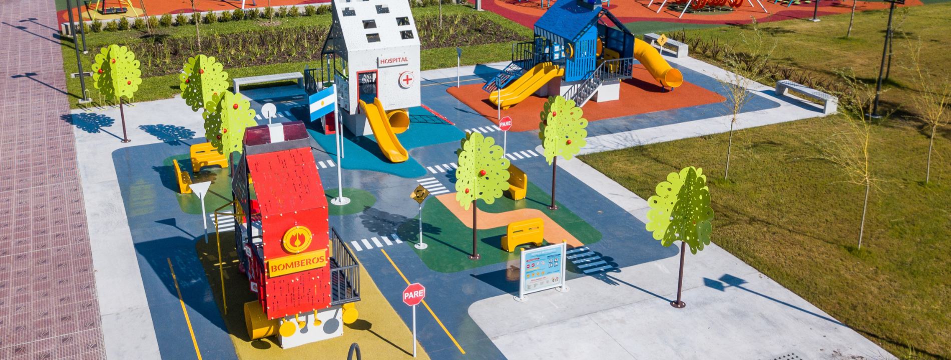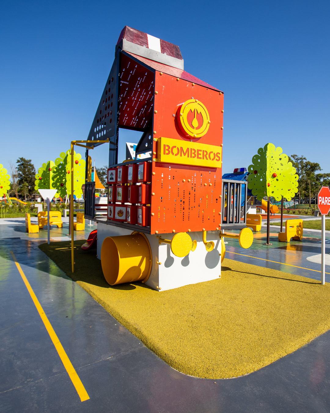 Cada edificio ofrece múltiples posibilidades de juego: tubos de bomberos, toboganes, comunicadores, paneles de memoria, sectores de trepada y recorridos que combinan actividad física con juego simbólico. El entorno se completa con señales de tránsito y árboles temáticos que amplían la experiencia y permiten construir una auténtica “ciudad de juego”.