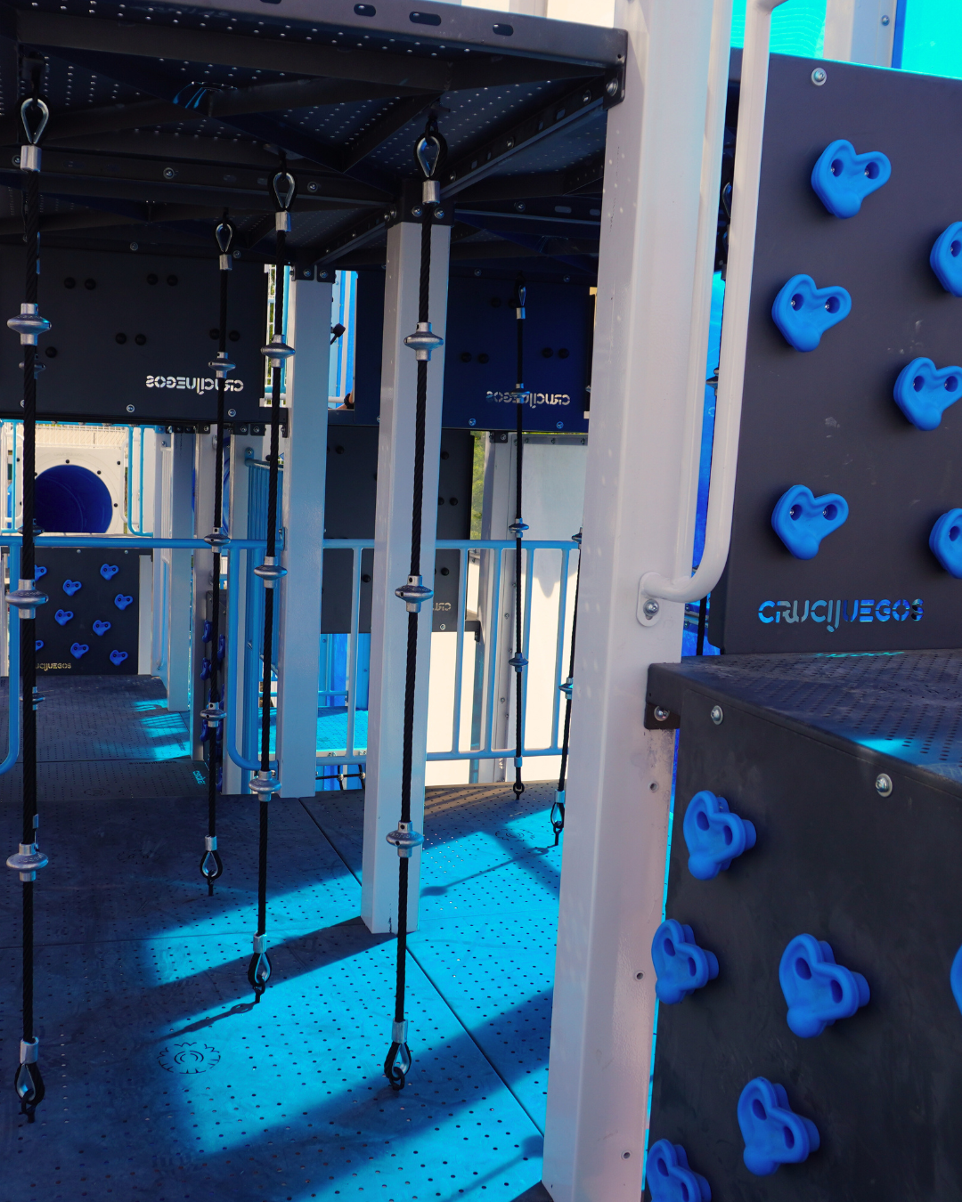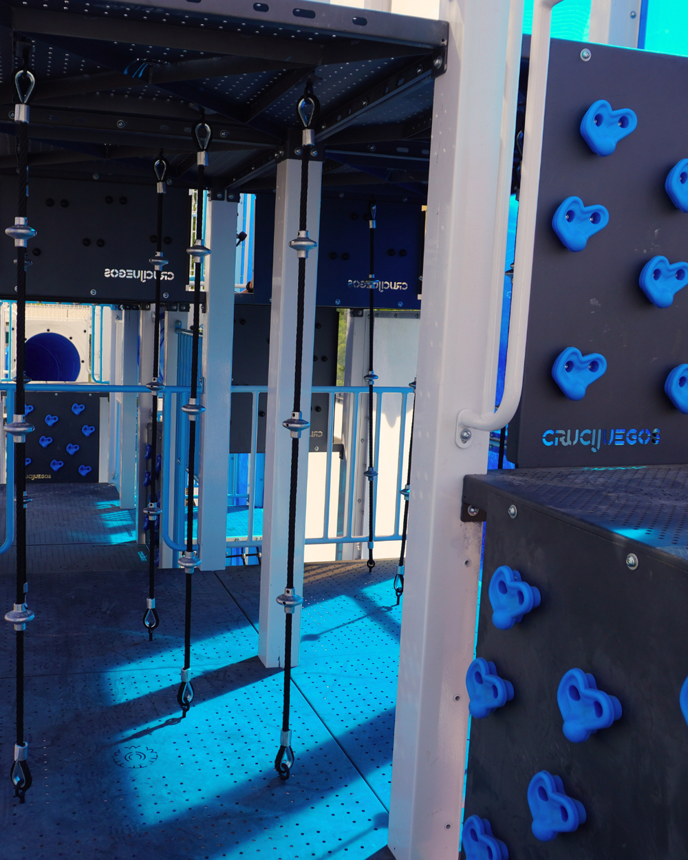 Con un imponente mangrullo en forma de cuadro este juego gigante convoca a desafiar los miedos y poner a prueba la destreza de los más pequeños pasando por 6 distintos niveles de altura con diferentes situaciones de juego: tomas de escalar, trepadores con sogas, rampas, tubos de gateo que conectan el juego entre sí y redes para trepar. La pared trasera está cubierta parcialmente por policarbonatos traslúcidos con los colores de la insignia patria que generan una interacción visual al proyectar la luz sobre los pisos y el entorno. En los extremos del piso superior se ubican dos toboganes cerrados de 3,5 mt de altura que descienden en zig-zag hasta la base.