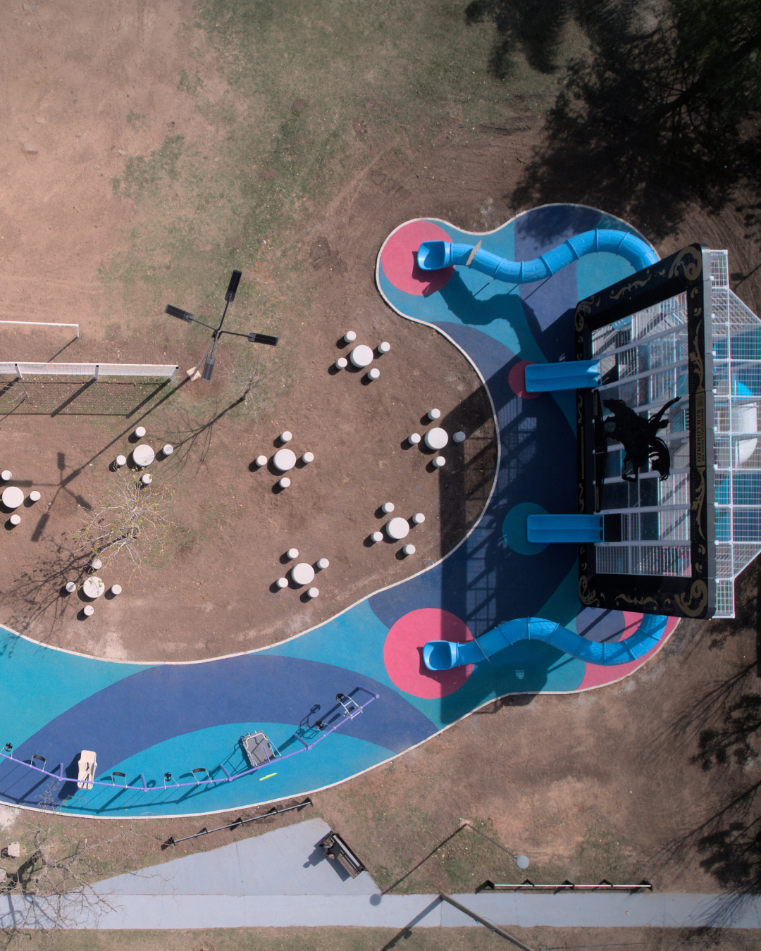 Además el patio dispone de un mangrullo Lilo primera infancia que cuenta con paneles Ta Te Ti de memoria, tambores, túnel de gateo y toboganes pequeños para poder deslizarse. Compuesta por calesitas, pórticos sextuple con una configuración diferente, spinners, dinos con resorte, sube y bajas esta plaza es ideal para jugar al aire libre y disfrutar del entorno. La plaza está cubierta por 438 m2 de suelo antigolpes de color rosa, celeste y violeta de Bongo y 10 conjunto de livings de hormigón de Vanka que hacen de este espacio un lugar único para disfrutar mientras los niños juegan.